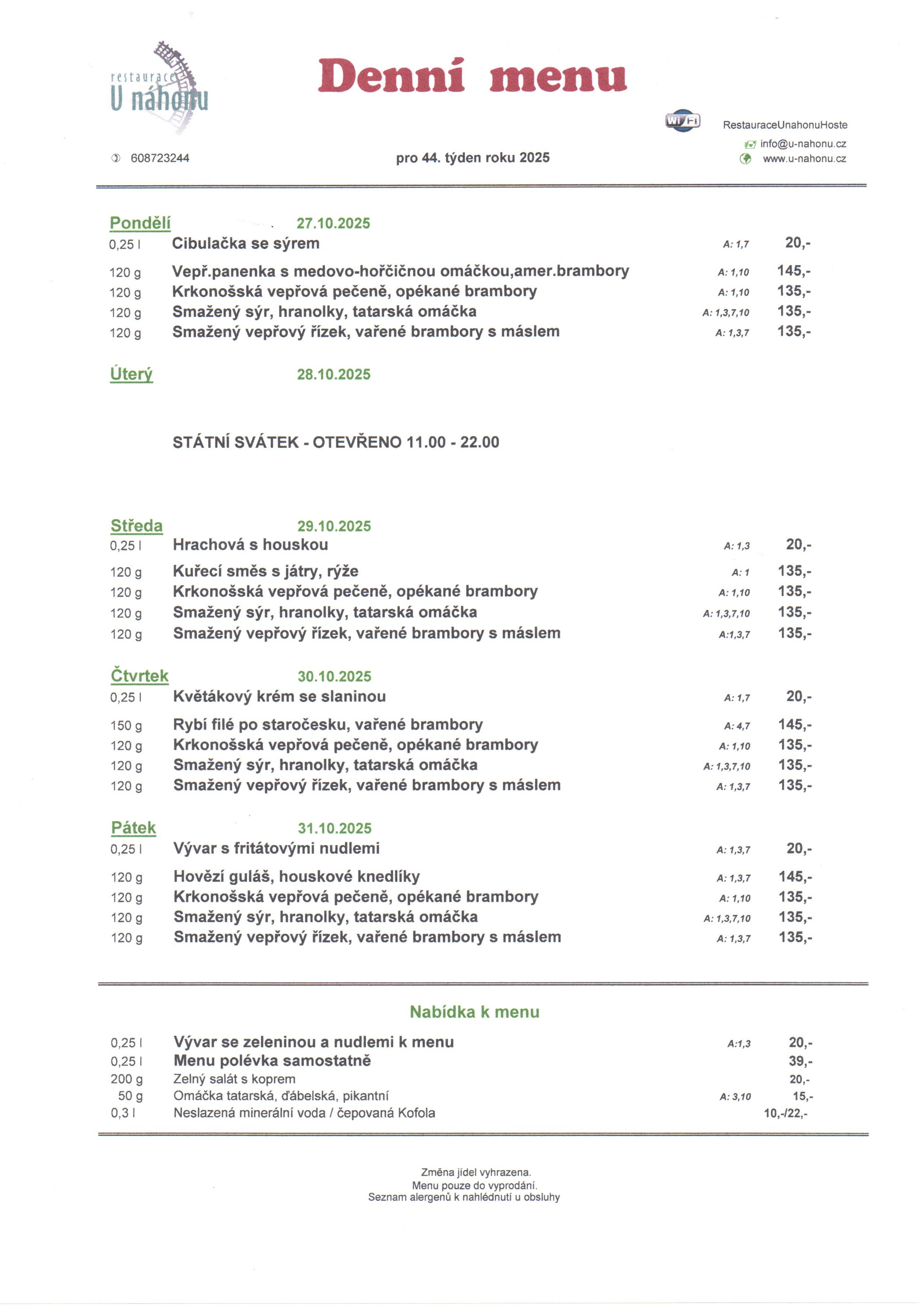 Vaši rezervaci vždy ochotně vyřídíme. Těšíme se na Vás! Rezervaci můžete podat přes telefonicky na +420608723244. Příjímáme platby v hotovosti. Pohodlně zaplatíte i stravenkami Ticket Restaurant®, kartou VISA, bezkontaktní platbou a kartou Mastercard. Pokrmy u nás připravené si můžete předem objednat a my Vám je zabalíme s sebou. Nabízíme prostory pro soukromé či firemní akce. Kontaktujte nás v případě zájmu. Hledáte netradiční místo pro svou svatbu? K dispozici jsou Vám luxusní prostory a zajištění celého cateringu podle Vašich představ. Kontaktujte nás a domluvte si osobní schůzku. Otevřeno pro Vás máme každý všední den i o víkendu.