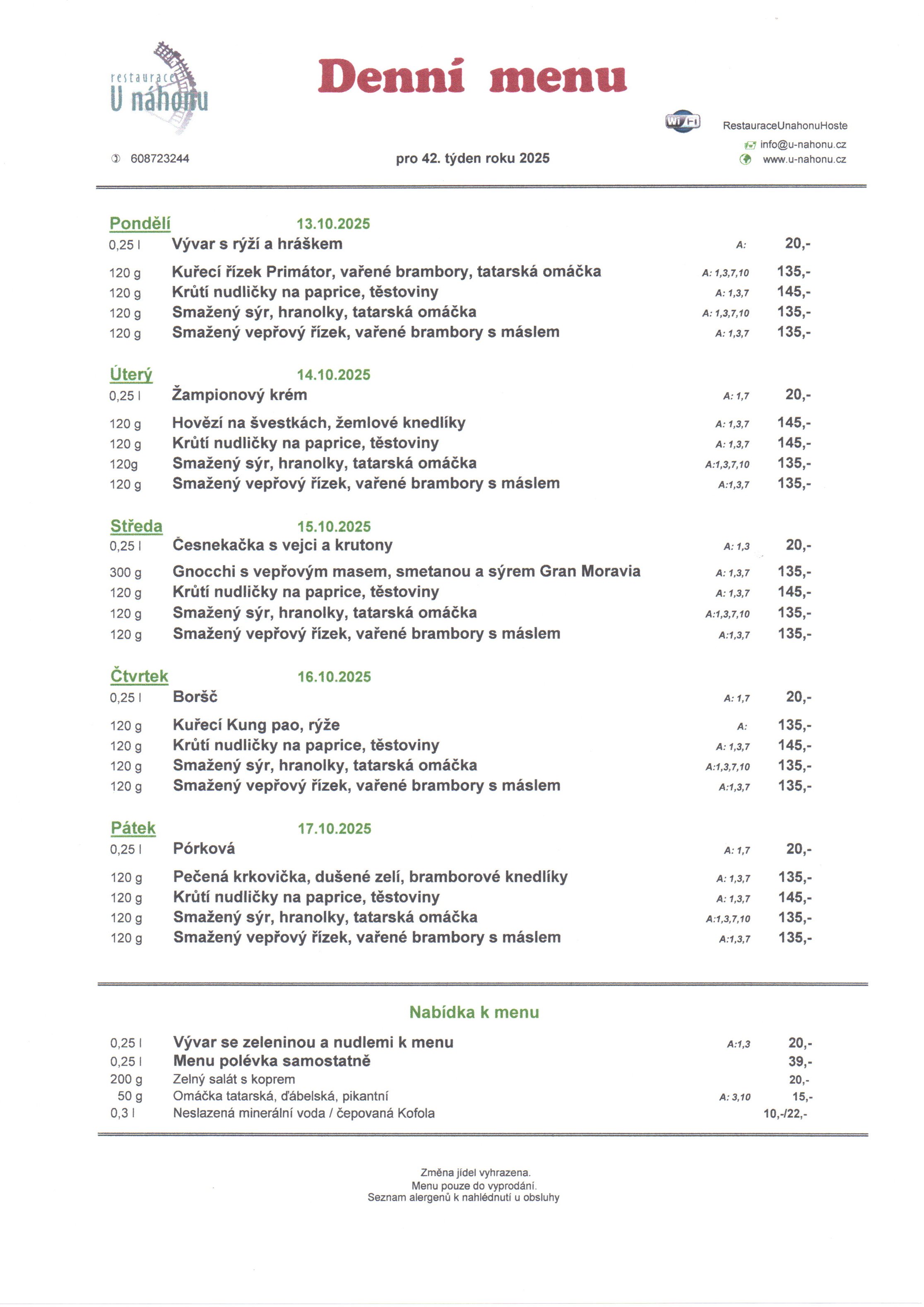 Vaši rezervaci vždy ochotně vyřídíme. Těšíme se na Vás! Rezervaci můžete podat přes telefonicky na +420608723244. Příjímáme platby v hotovosti. Pohodlně zaplatíte i stravenkami Ticket Restaurant®, kartou VISA, bezkontaktní platbou a kartou Mastercard. Pokrmy u nás připravené si můžete předem objednat a my Vám je zabalíme s sebou. Nabízíme prostory pro soukromé či firemní akce. Kontaktujte nás v případě zájmu. Hledáte netradiční místo pro svou svatbu? K dispozici jsou Vám luxusní prostory a zajištění celého cateringu podle Vašich představ. Kontaktujte nás a domluvte si osobní schůzku. Otevřeno pro Vás máme každý všední den i o víkendu.